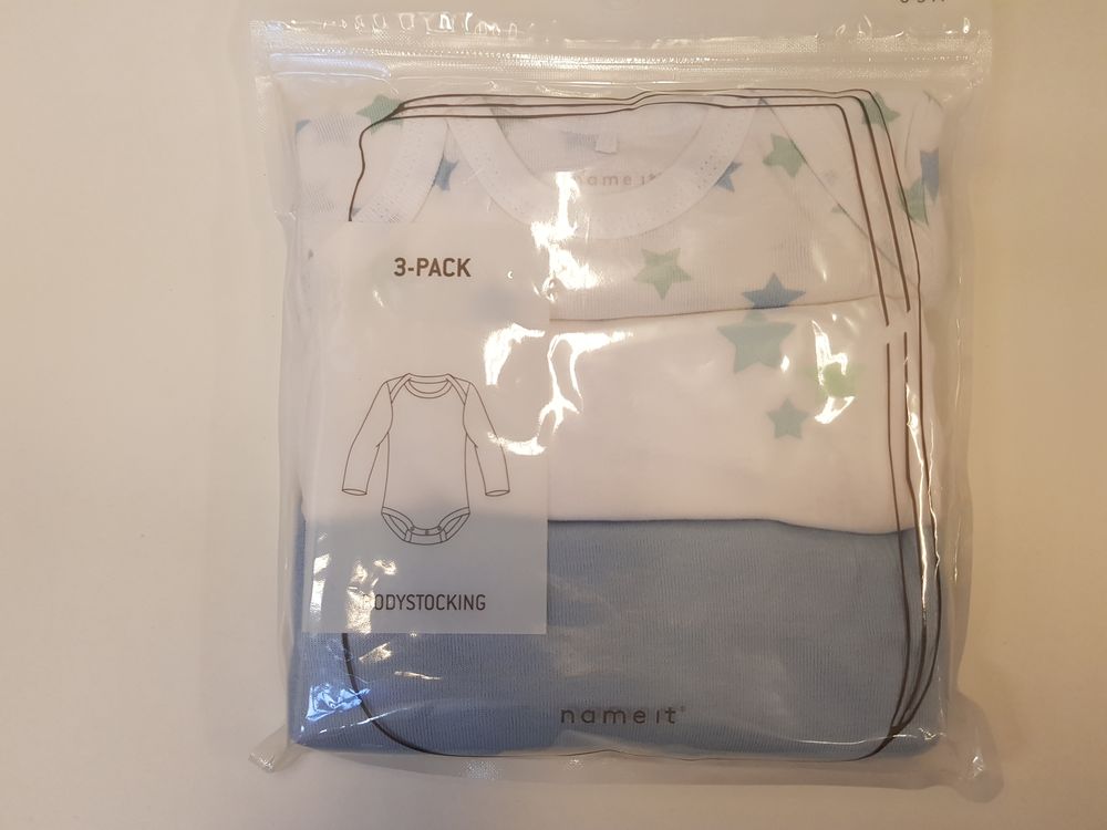 Name It bodide komplekt, 62 cm. Komplektis on kolm bodi. Koostis: 100% puuvill.