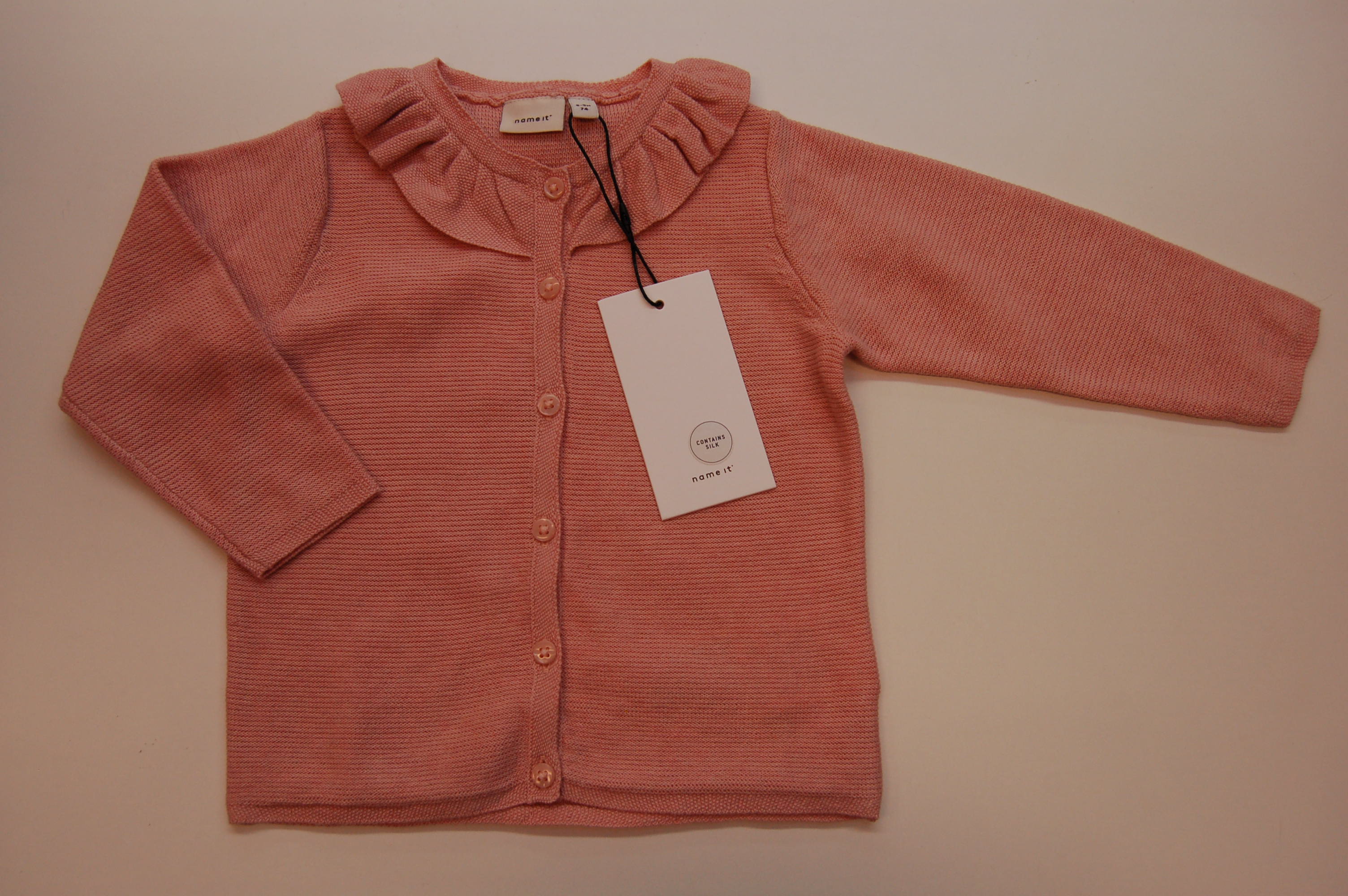 Name it ilus pidulik kootud kardigan, mis sisaldab siidi. Koostis: 90% puuvill, 10% siid.