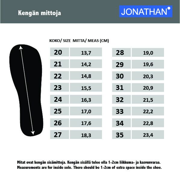 Jonathani kummikud on hädavajalikud vihmasteks ilmadeks ja neist on saanud laste lemmikud. Kummikutesse on lihtne sisse astuda ja nendega on mugav kõndida ning varbad on kuivad olenemata ilmast. Kerge disainiga ja elastne tald, mis moodustab lapse jala loomuliku liikumise. Eemaldatav sisetald. Vajadusel võib lisada termosokid.