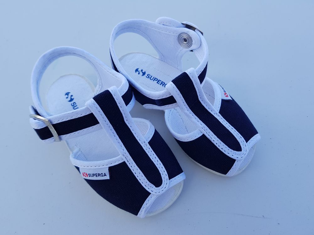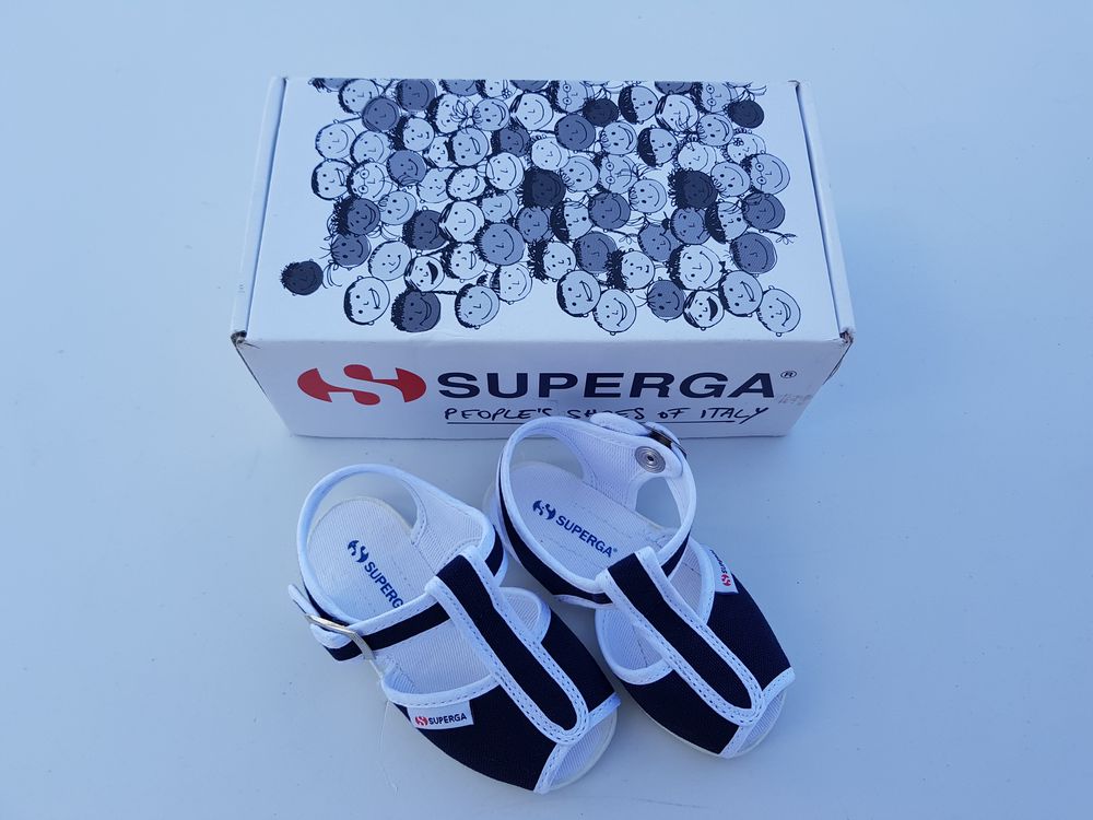 Superga pehme tallaga ägedad sandaalid, suurus 22. Pealt on riidest, tald on kummine ja kinnitus on trukiga. (Itaalia)