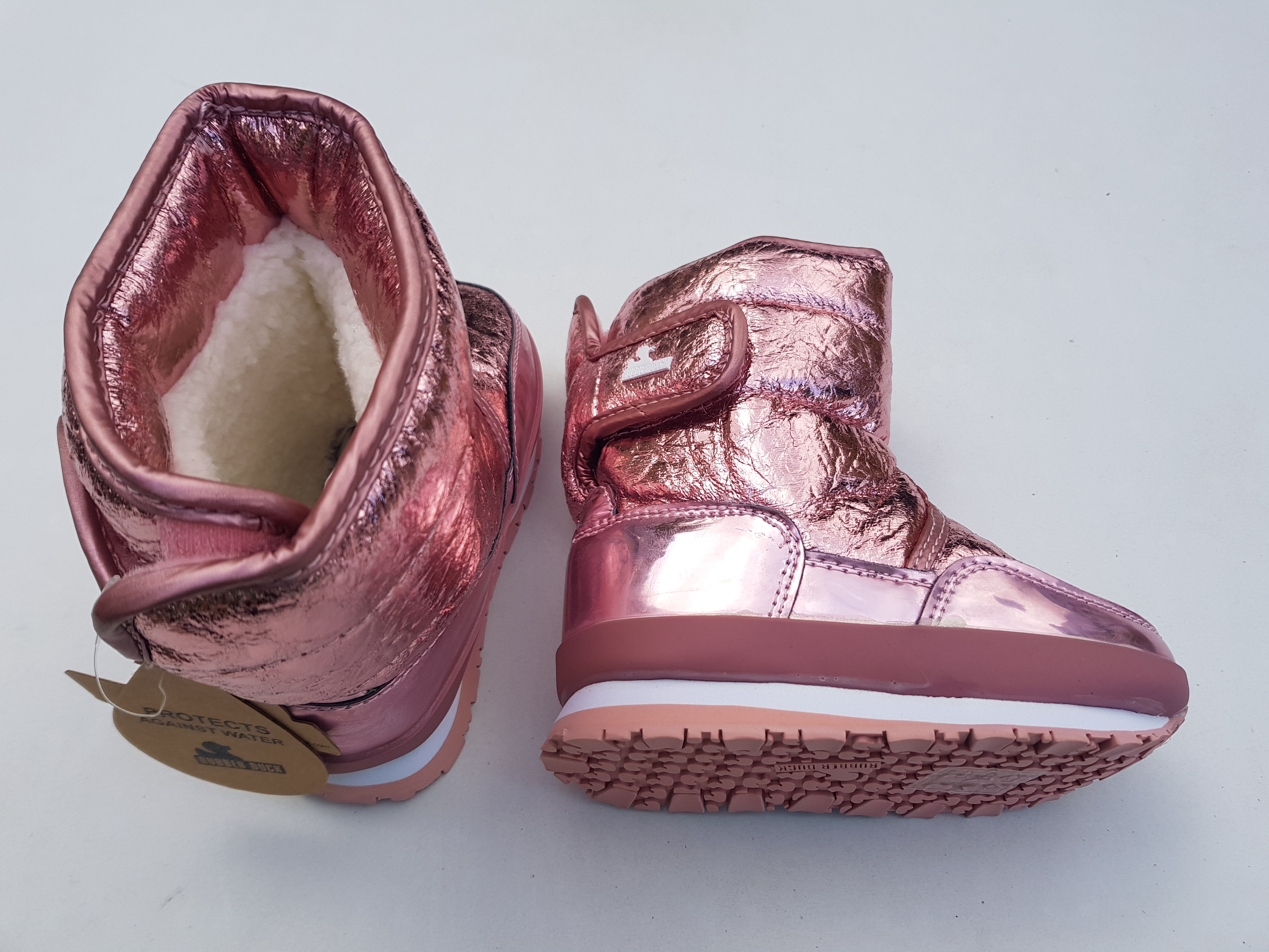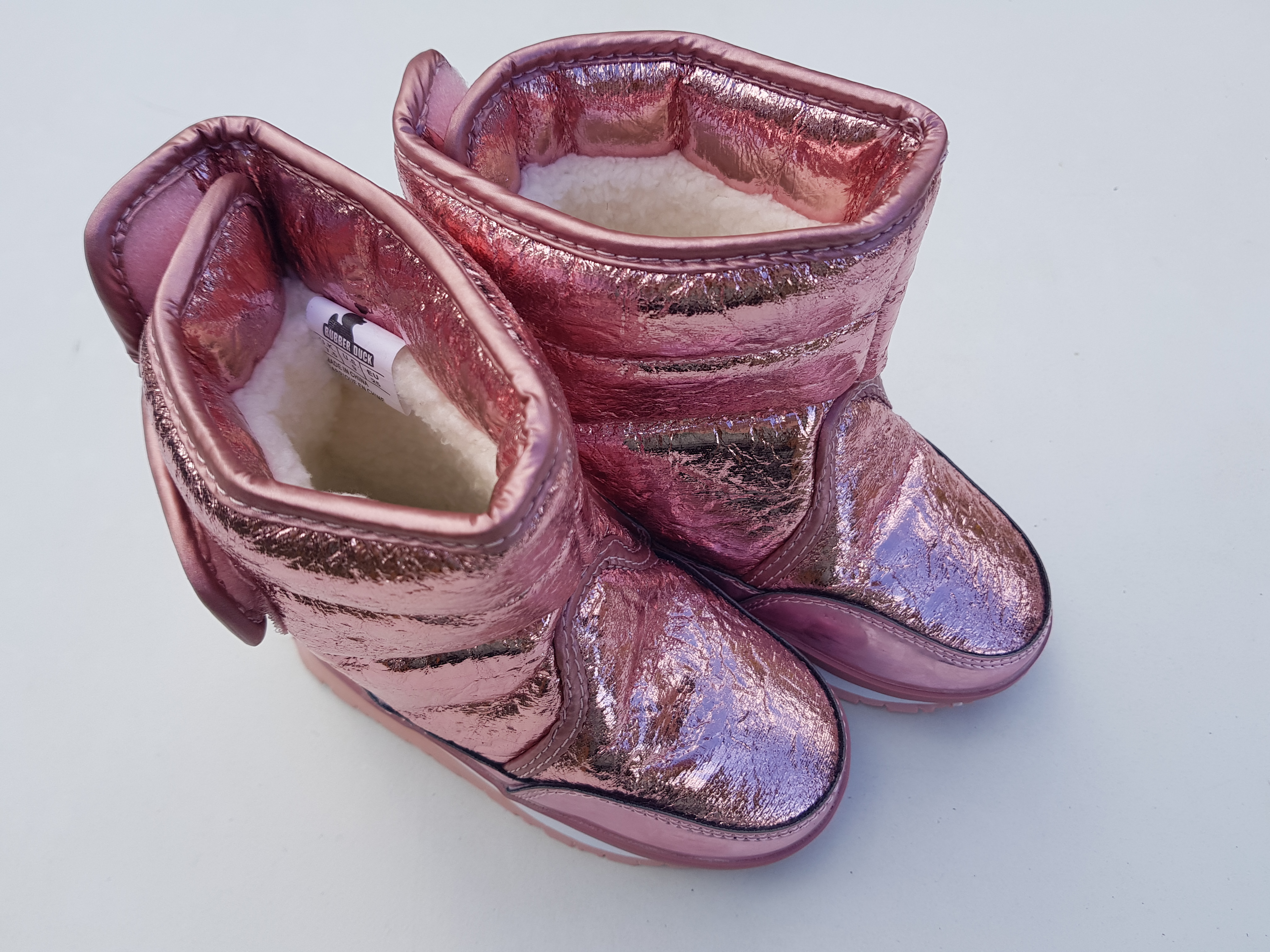 Rubber Duck mega ilusad talvesaapad, suurus 25. Pragunenud välimusega metallik heleroosast lakknahast saapad. Saapad on imekerged, soojad ja veekindlad. Saabaste sees on hästi pehme karvane vooder ja eemaldatav sisetald. Välistald on on kummist, mis tagab hea haarduvuse. Sisetald 16,5 cm. Materjal: Välispind: tekstiil + nahk ja sees tekstiilist vooder.