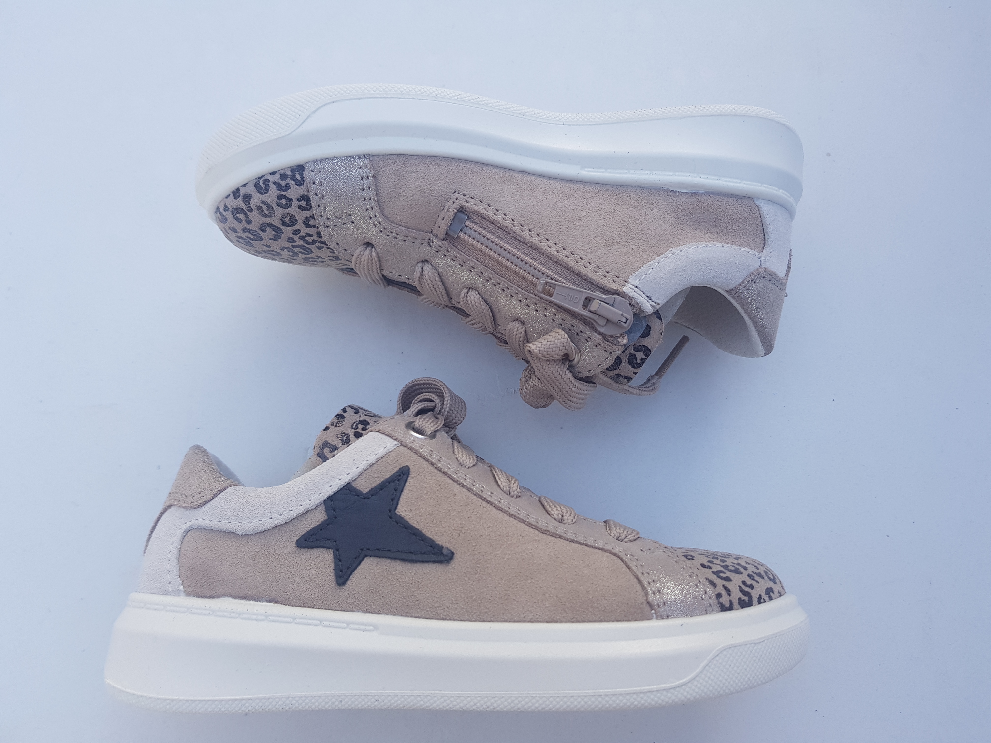 Superfit ülistiilsed täisnahast tossud, suurus 27. Lahe naha ja tekstiili kombinatsioon, optiliselt kontrastne tald ja täht ühel küljel annavad madalale jalatsile vabaaja ilme. Praktilise küljetõmblukuga tossud sobivad ideaalselt kõigile lastele, kes ei jõua ära oodata, millal uksest välja pääsevad. Valge PU-tald täiendab sportlikku iseloomu. Jalatsi sees on nahast eemaldatav sisetald ja tekstiilist vooder.
