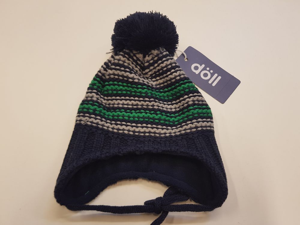 Döll soe ja veniv kootud tutimüts, suurus 49. Mütsi sisemuses fliisvooder ringjalt ümber kõrvade. Koostis: 100% polüakrüül ja voodriosa 100% polüester. Originaalhind 20.95€
