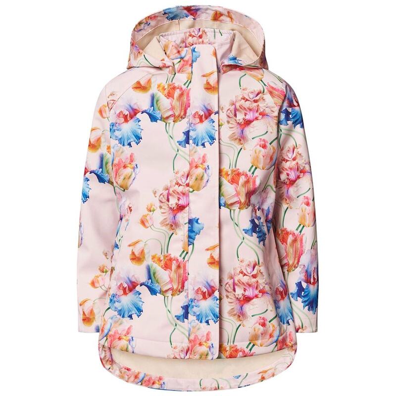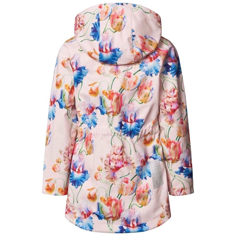 Imeilus roosa tuule- ja veekindel softshell-jope taaskasutatud polüestrist värvilise kunstiliste tulpide mustriga. Jopel on eemaldatav kapuuts, küljetaskud trukkidega, tuuleklapp luku ees ja helkurdetailid. Sees on pehme fliisvooder ja vöökohal elastne riba istuvuse reguleerimiseks..