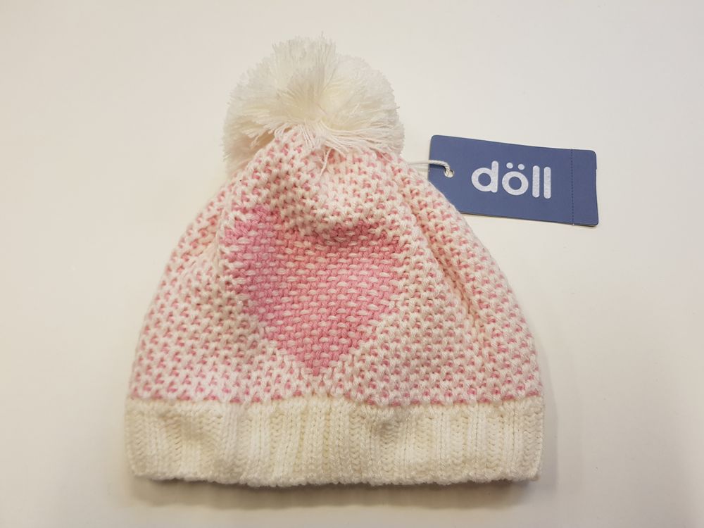 Döll soe ja veniv kootud tutimüts, suurus 51. Mütsi sisemuses fliisvooder ringjalt ümber kõrvade. Koostis: 100% polüakrüül ja voodriosa 100% polüester. Originaalhind 19.95€