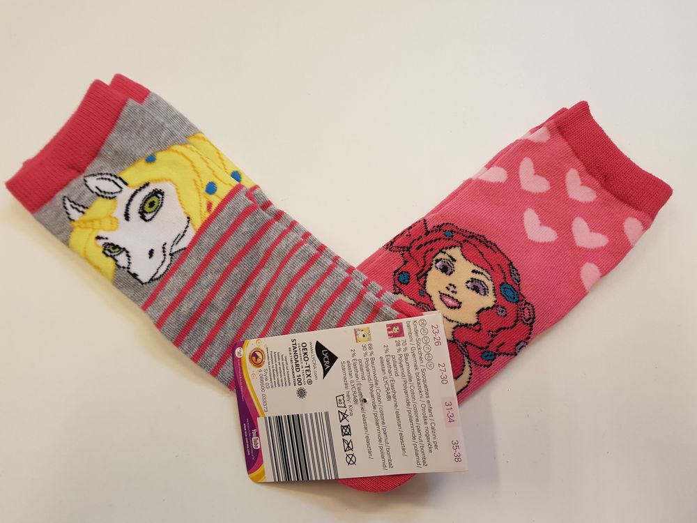Armsad laste sokid. Koostis: tüdrukuga - 70% puuvill, 28% polüamiid, 2% elastaan. Poniga - 68% puuvill, 30% polüamiid, 2% elastaan.